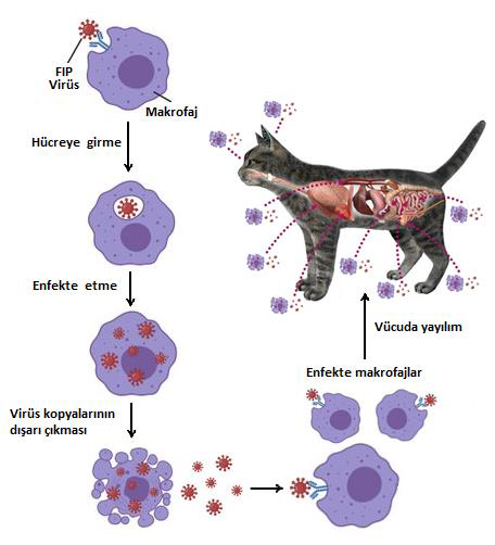 FIP virüsü mide – bağırsak duvarı hücrelerine gelen makrofajların yüzeyine tutunarak makrofaj hücresinin içine girer ve onları enfekte eder. FIP virüsü ile enfekte olmuş makrofajlar, daha sonra karın ve göğüs boşlukları içindeki diğer bölgelere, iç organlara, böbreklere, akciğerlere, karaciğere, kalbe, sinir sistemine, gözler ile beyin gibi organlara seyahat ederken virüs de vücudun farklı yerlerine taşınmış olur.