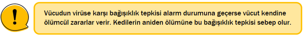 Virüse karşı kedinin bağışıklık sistemi savunmaya geçer. Kandaki akyuvarların bir çeşidi olan monosit hücreleri farklılaşır makrofajlara dönüşür. Makrofajlar virüsleri (ve vücuda giren diğer mikropları) yutan dev hücreler olarak vücudun ilk savunmasını oluşturur. Makrofajlar virüsleri yutmak üzere kan damarlarından virüslerin olduğu dokulara geçer.